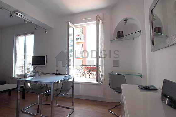 SalónEste apartamento está formado por un salón con parquet en el suelo y ventanas doble acristalamiento y una vista a al patio. Este salón muy tanquilo está amueblado y equipado para que su estancia sea agradable : televisor, sábanas, edredones, mesa, mesita, mesa de estudio, estantería, cómoda, 3 silla(s)1 sofá cama, 1 cama.