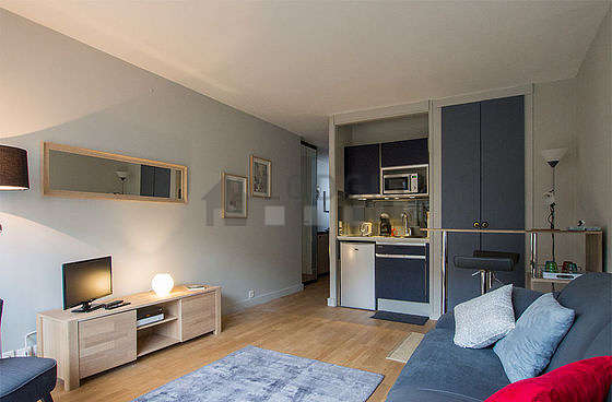 Este apartamento está formado por un salón con parquet en el suelo y ventanas doble acristalamiento, un balcon y una vista a la calle. Este salón está amueblado y equipado para que su estancia sea agradable : sábanas, edredones, 1 sillones, cómoda, armario empotrado, taburete1 sofá cama.