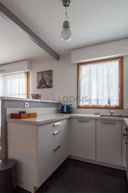 Este apartamento posee una bonito cocina con azulejo en el sueloy todo el equipamiento esencial para su vida diaria : placas eléctricas, refrigerador, congelador, horno, horno micro-ondas, campana extractora, tostador, cafetera, armario empotrado, vajilla.