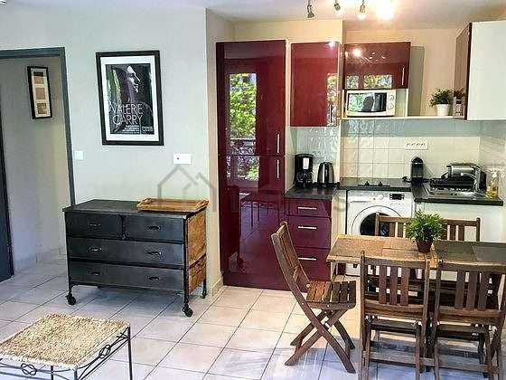 Este apartamento posee una bonito cocina con azulejo en el sueloy todo el equipamiento indispensable para su vida diaria : placas eléctricas, refrigerador, horno, micro ondas, congelador, campana extractora, tostador, hervidor, cafetera, armario empotrado, vajilla.