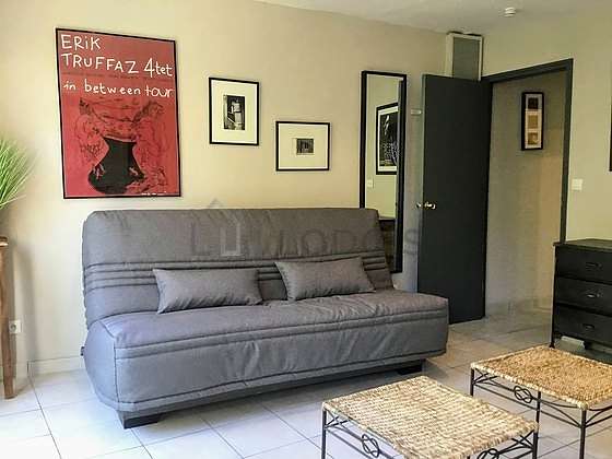 SalónEste apartamento está formado por un salón con azulejo en el suelo y ventanas doble acristalamiento y una vista a la calle. Este salón tranquilo está amueblado y equipado para que su estancia sea agradable : televisor, sábanas, edredones, mesa, mesita, cómoda, 6 silla(s)2 sofá cama.