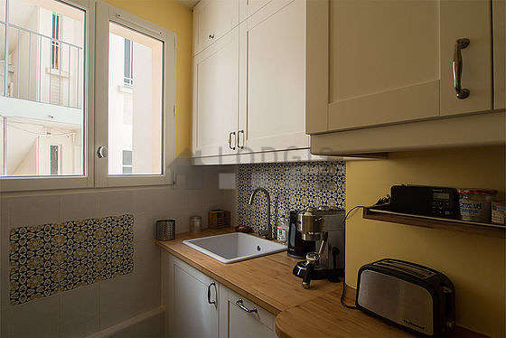 Este apartamento posee una magnífica cocina con azulejo en el sueloy todo el equipamiento esencial para su vida diaria : placas eléctricas, congelador, horno, campana extractora, tostador, hervidor, cafetera, estantería, armario empotrado, vajilla, electrodomésticos.
