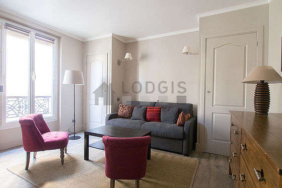 Este apartamento está formado por un salón con parquet en el suelo y ventanas doble acristalamiento y una vista a al patio. Este salón tranquilo está amueblado y equipado para que su estancia sea agradable : televisor, sábanas, edredones, 1 sillones, mesita, ropero, estantería, cómoda, armario empotrado, 1 silla(s), floor lamp, lamp, blinds, painting1 sofá cama.