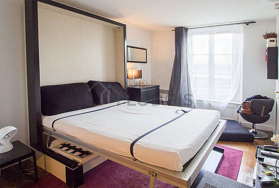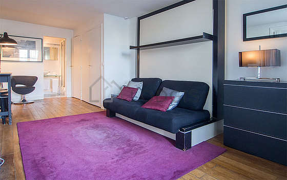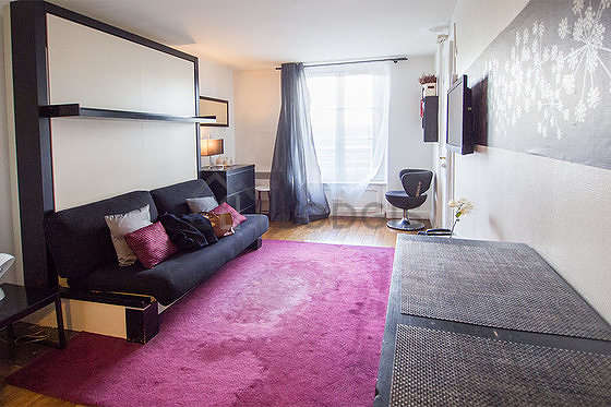 Este apartamento está formado por un salón con parquet en el suelo y ventanas doble acristalamiento. Este salón tranquilo está amueblado y equipado para que su estancia sea agradable : televisor, sábanas, edredones, sofá, 1 sillones, mesa, ropero, estantería, cómoda, armario empotrado, taburete1 cama.