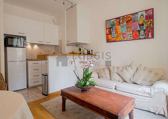 Este apartamento está formado por un salón con parquet en el suelo y ventanas doble acristalamiento y una vista a la calle. Este salón está amueblado y equipado para que su estancia sea agradable : sofá, mesa, mesita, 2 silla(s).