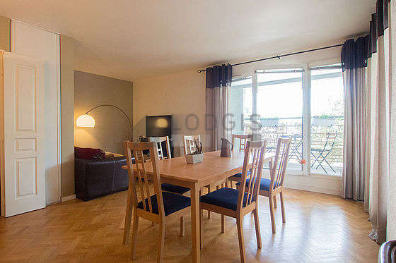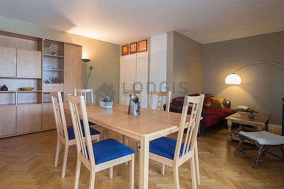 Este apartamento está formado por un salón con parquet en el suelo y ventanas doble acristalamiento, un balcon y una vista a la calle. Este salón tranquilo está amueblado y equipado para que su estancia sea agradable : televisor, sofá, mesa, mesita, biblioteca, armario empotrado, 6 silla(s), tv stand.