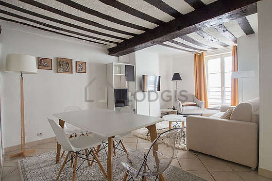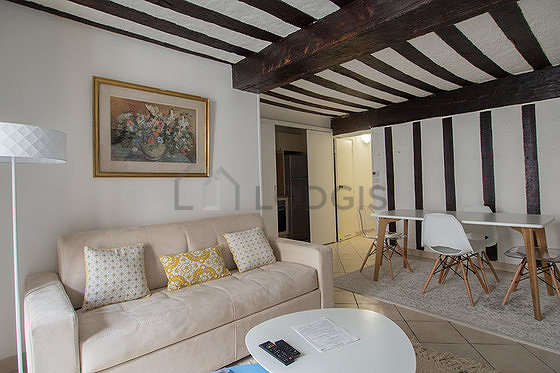 Este apartamento está formado por un salón con azulejo en el suelo y ventanas doble acristalamiento. Este salón tranquilo está amueblado y equipado para que su estancia sea agradable : televisor, 1 sillones, mesa, estantería, viga, 4 silla(s), set of tables1 sofá cama.