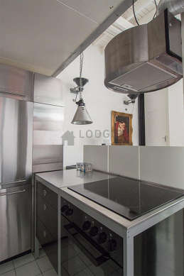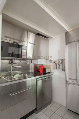 Este apartamento posee una bonito cocina con azulejo en el sueloy todo el equipamiento indispensable para su vida diaria : placas eléctricas, refrigerador, congelador, horno, micro ondas, campana extractora, tostador, hervidor, armario empotrado, vajilla.