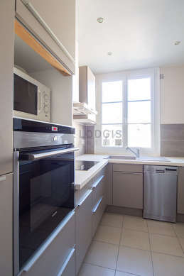 Este apartamento posee una magnífica cocina con azulejo en el sueloy todo el equipamiento indispensable para su vida diaria : placas eléctricas, refrigerador, congelador, horno, micro ondas, campana extractora, cafetera, estantería, armario empotrado, vajilla.