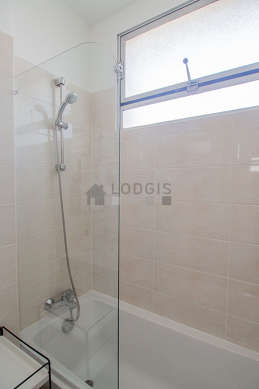 Este apartamento tiene una sala de baño agradable y clara. Este baño tiene todo lo necesario para su bienestar diario : estantería, bañera, secador de pelo, wall light, mirror, towel rack. El WC está separado de la sala del baño y ubicado en un espacio independiente.