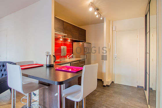 Este apartamento posee una bonito cocina con azulejo en el sueloy todo el equipamiento esencial para su vida diaria : placas eléctricas, refrigerador, congelador, horno micro-ondas, campana extractora, hervidor, armario empotrado, vajilla, 3 silla(s), bar, light.