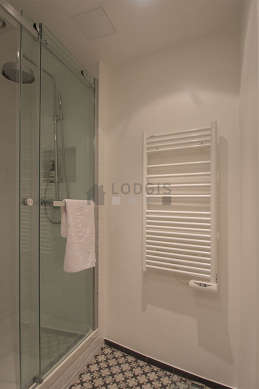 Este apartamento tiene una sala de baño agradable y clara. Este baño tiene todo lo necesario para su bienestar diario : toallas, estantería, ducha, sink, radiador seca-toallas. El WC está separado de la sala del baño y ubicado en un espacio independiente.