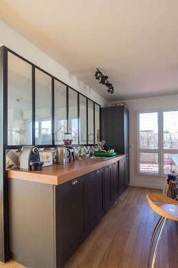 Este apartamento posee una magnífica cocina con parquet en el sueloy todo el equipamiento esencial para su vida diaria : placas eléctricas, refrigerador, congelador, horno, tostador, hervidor, cafetera, armario empotrado, vajilla, electrodomésticos, taburete, bar.