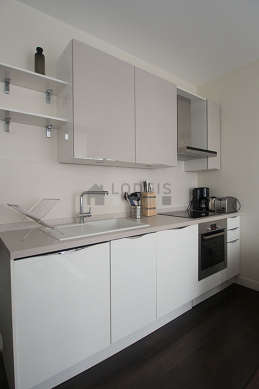 Este apartamento posee una magnífica cocina con parquet en el sueloy todo el equipamiento esencial para su vida diaria : placas eléctricas, refrigerador, horno, congelador, campana extractora, tostador, hervidor, cafetera, estantería, armario empotrado, vajilla.