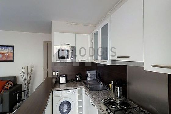 Este apartamento posee una bonito cocina con azulejo en el sueloy todo el equipamiento indispensable para su vida diaria : placas eléctricas, refrigerador, congelador, horno micro-ondas, campana extractora, tostador, hervidor, cafetera, armario empotrado, vajilla, bar.