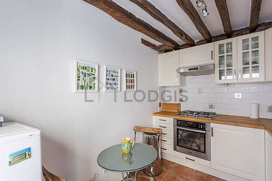 Este apartamento posee una magnífica cocina con azulejo en el sueloy todo el equipamiento esencial para su vida diaria : placas eléctricas, refrigerador, micro ondas, campana extractora, tostador, hervidor, cafetera, mesa, armario empotrado, vajilla, 1 silla(s).