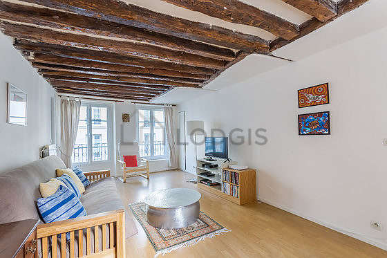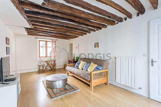 Este apartamento está formado por un salón con parquet en el suelo una vista a al patio. Este salón muy tanquilo está amueblado y equipado para que su estancia sea agradable : televisor, sofá, mesa, mesita, armario empotrado, viga, taburete1 futón.