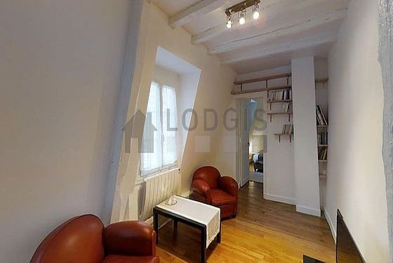 Este apartamento está formado por un salón con parquet en el suelo y ventanas doble acristalamiento. Este salón muy tanquilo está amueblado y equipado para que su estancia sea agradable : televisor, 2 sillones, mesita, viga, tv stand.