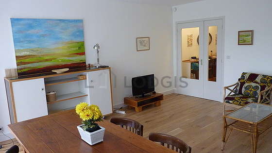 Este apartamento está formado por un salón con parquet en el suelo. Este salón muy tanquilo está amueblado y equipado para que su estancia sea agradable : televisor, sofá, 1 sillones, mesa, cómoda, 1 silla(s).