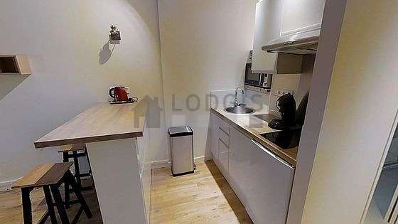 Este apartamento posee una bonito cocina con parquet en el sueloy todo el equipamiento indispensable para su vida diaria : placas eléctricas, refrigerador, horno micro-ondas, congelador, campana extractora, cafetera, estantería, armario empotrado, vajilla, 2 silla(s), bar.
