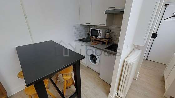 Este apartamento posee una bonito cocina con linoleum en el sueloy todo el equipamiento necesario para su vida diaria : placas eléctricas, refrigerador, micro ondas, congelador, campana extractora, hervidor, mesa, vajilla, taburete.