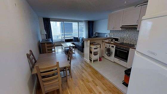 Este apartamento posee una bonito cocina con azulejo en el sueloy todo el equipamiento esencial para su vida diaria : placas eléctricas, refrigerador, congelador, horno, micro ondas, campana extractora, hervidor, mesa, estantería, armario empotrado, vajilla, 4 silla(s), bar.