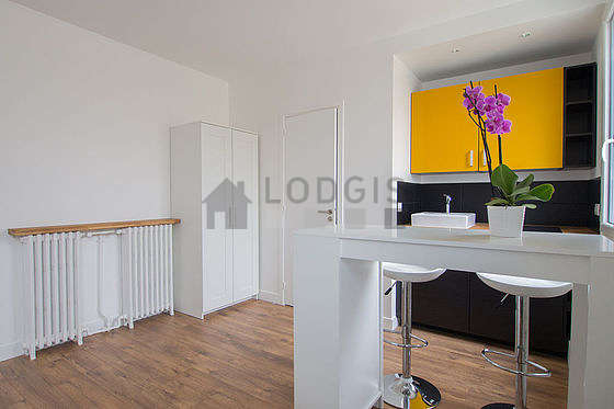 Este apartamento posee una magnífica cocina contiguo al salón con parquet en el sueloy todo el equipamiento esencial para su vida diaria : placas eléctricas, refrigerador, horno micro-ondas, congelador, campana extractora, cafetera, estantería, armario empotrado, vajilla, taburete, bar.