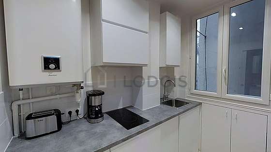 Este apartamento posee una bonito cocina contiguo al salón con parquet en el sueloy todo el equipamiento indispensable para su vida diaria : placas eléctricas, refrigerador, congelador, tostador, cafetera, armario empotrado, vajilla.