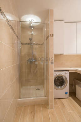 Este apartamento tiene una sala de baño magnífica. Este baño tiene todo lo necesario para su bienestar diario : toallas, armario empotrado, ducha, sink, radiador seca-toallas. El WC está separado de la sala del baño y ubicado en un espacio independiente.