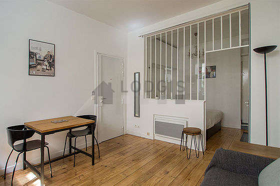 Este apartamento está formado por un salón con parquet en el suelo una vista a al patio. Este salón muy tanquilo está amueblado y equipado para que su estancia sea agradable : televisor, mesa, mesita, estantería, 4 silla(s), taburete1 sofá cama.
