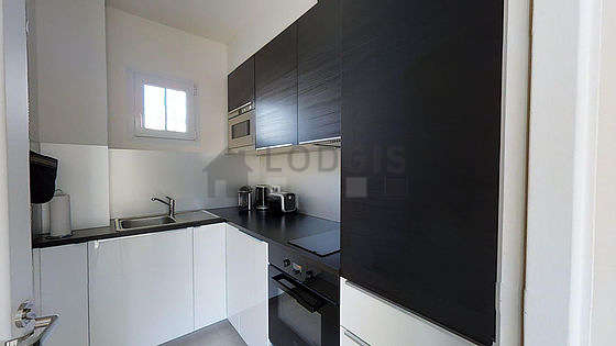 Este apartamento posee una cocina con azulejo en el sueloy todo el equipamiento esencial para su vida diaria : placas eléctricas, refrigerador, congelador, horno, micro ondas, campana extractora, tostador, hervidor, cafetera, estantería, armario empotrado, vajilla.