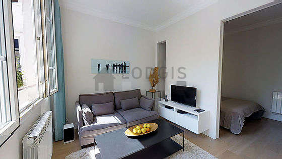 Este apartamento está formado por un salón con parquet en el suelo una vista a al patio. Este salón muy tanquilo está amueblado y equipado para que su estancia sea agradable : televisor, sofá, 1 sillones, mesa, mesita, ropero, estantería, armario, armario empotrado, 4 silla(s).
