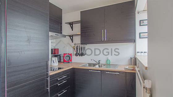 Este apartamento posee una bonito cocina con parquet en el sueloy todo el equipamiento esencial para su vida diaria : placas eléctricas, refrigerador, micro ondas, congelador, campana extractora, hervidor, cafetera, estantería, armario empotrado, vajilla, 2 silla(s), bar.
