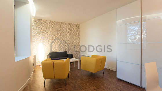 SalónEste apartamento está formado por un salón con parquet en el suelo una vista a jardín. Este salón muy tanquilo está amueblado y equipado para que su estancia sea agradable : televisor, sofá, mesa, mesita, mesa de estudio, ropero, armario, armario empotrado, 4 silla(s).