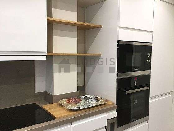 Este apartamento posee una bonito cocina con azulejo en el sueloy todo el equipamiento indispensable para su vida diaria : placas eléctricas, refrigerador, horno, micro ondas, campana extractora, tostador, hervidor, cafetera, mesa, estantería, armario empotrado, vajilla, 2 silla(s).