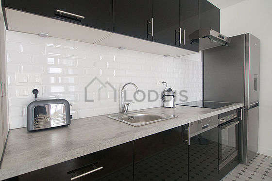 Este apartamento posee una magnífica cocina con azulejo en el sueloy todo el equipamiento indispensable para su vida diaria : placas eléctricas, refrigerador, congelador, horno, micro ondas, campana extractora, tostador, hervidor, cafetera, armario empotrado, taburete, bar.