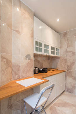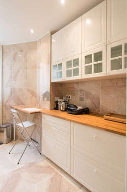 Este apartamento posee una magnífica cocina con azulejo en el sueloy todo el equipamiento indispensable para su vida diaria : placas eléctricas, refrigerador, congelador, horno, campana extractora, hervidor, cafetera, armario empotrado, vajilla, taburete, bar.