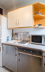 Este apartamento posee una bonito cocina con azulejo en el sueloy todo el equipamiento necesario para su vida diaria : placas eléctricas, refrigerador, congelador, horno, micro ondas, tostador, hervidor, cafetera, mesita, armario empotrado, vajilla, 1 silla(s).