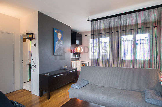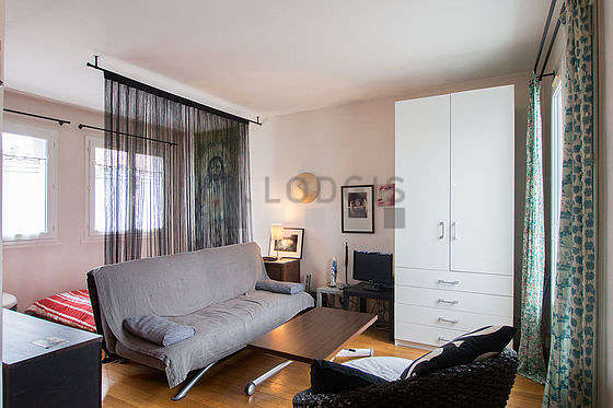 Este apartamento está formado por un salón con parquet en el suelo y ventanas doble acristalamiento, un balcon y una vista a la calle. Este salón muy tanquilo está amueblado y equipado para que su estancia sea agradable : televisor, sábanas, edredones, 1 sillones, mesita, estantería, armario, aparador1 sofá cama, 1 cama.