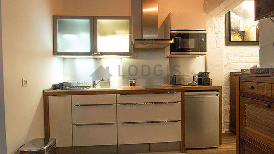 Este apartamento posee una magnífica cocina con parquet en el sueloy todo el equipamiento indispensable para su vida diaria : placas eléctricas, refrigerador, congelador, micro ondas, congelador, campana extractora, tostador, hervidor, cafetera, armario empotrado, vajilla.