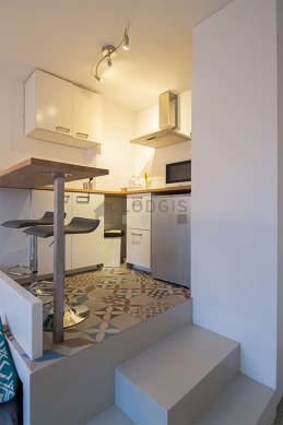 Este apartamento posee una magnífica cocina con azulejo en el sueloy todo el equipamiento indispensable para su vida diaria : placas eléctricas, refrigerador, horno micro-ondas, congelador, campana extractora, tostador, cafetera, armario empotrado, vajilla, taburete, bar.