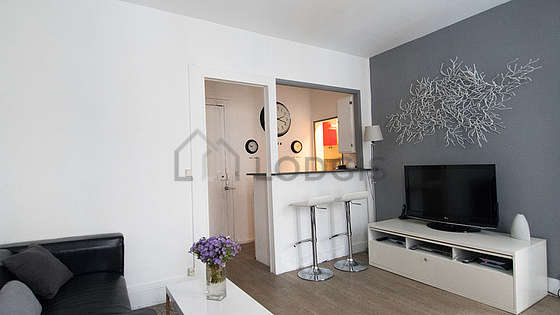 Este apartamento está formado por un salón con parquet en el suelo una vista a la calle. Este salón tranquilo está amueblado y equipado para que su estancia sea agradable : televisor, sofá, mesita, mesa de estudio, estantería, cómoda, armario empotrado, 3 silla(s).