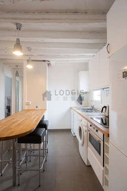 Este apartamento posee una magnífica cocina con parquet en el sueloy todo el equipamiento indispensable para su vida diaria : placas eléctricas, refrigerador, congelador, horno, campana extractora, tostador, hervidor, cafetera, estantería, armario empotrado, vajilla, taburete, bar.
