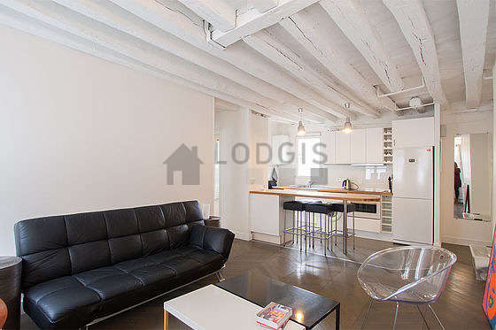 Este apartamento está formado por un salón con parquet en el suelo. Este salón muy tanquilo está amueblado y equipado para que su estancia sea agradable : televisor, 2 sillones, mesita, mesa de estudio, armario empotrado, viga1 sofá cama.