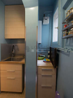 Este apartamento posee una bonito cocina con azulejo en el sueloy todo el equipamiento indispensable para su vida diaria : placas eléctricas, refrigerador, micro ondas, congelador, tostador, hervidor, cafetera, estantería, armario empotrado, vajilla.