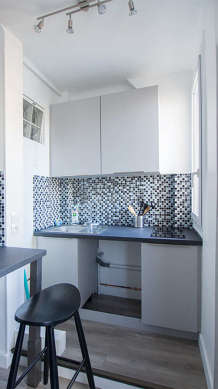 Este apartamento posee una magnífica cocina con parquet en el sueloy todo el equipamiento indispensable para su vida diaria : placas eléctricas, refrigerador, congelador, horno, tostador, cafetera, mesa, estantería, armario, armario empotrado, vajilla, taburete.