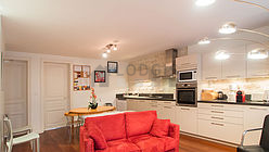 Este apartamento posee una bonito cocina con parquet en el sueloy todo el equipamiento esencial para su vida diaria : placas eléctricas, refrigerador, congelador, horno, micro ondas, campana extractora, tostador, hervidor, cafetera, mesa, armario empotrado, vajilla, 4 silla(s).