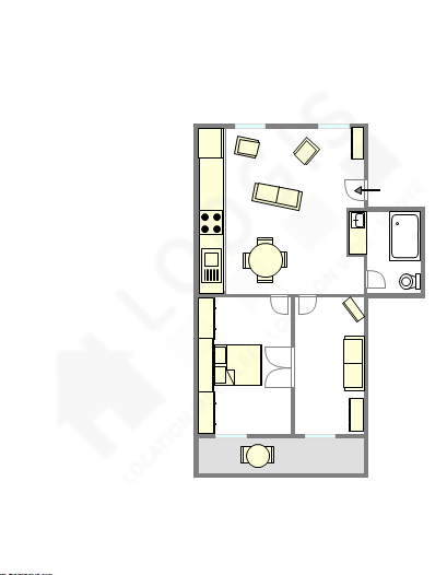 Este apartamento está formado por un salón con parquet en el suelo una vista a al patio. Este salón muy tanquilo está amueblado y equipado para que su estancia sea agradable : televisor, sofá, 1 sillones, mesita, estantería, taburete.