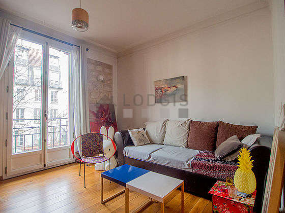 Este apartamento está formado por un salón con parquet en el suelo una vista a la calle. Este salón muy tanquilo está amueblado y equipado para que su estancia sea agradable : televisor, 1 sillones, mesita, biblioteca, estantería, piedras aparentes1 sofá cama.
