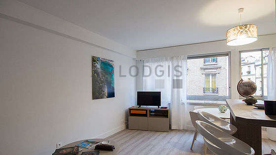 Este apartamento está formado por un salón con linoleum en el suelo una vista a la calle. Este salón está amueblado y equipado para que su estancia sea agradable : televisor, sábanas, edredones, mesa, mesita, 4 silla(s), taburete1 sofá cama.